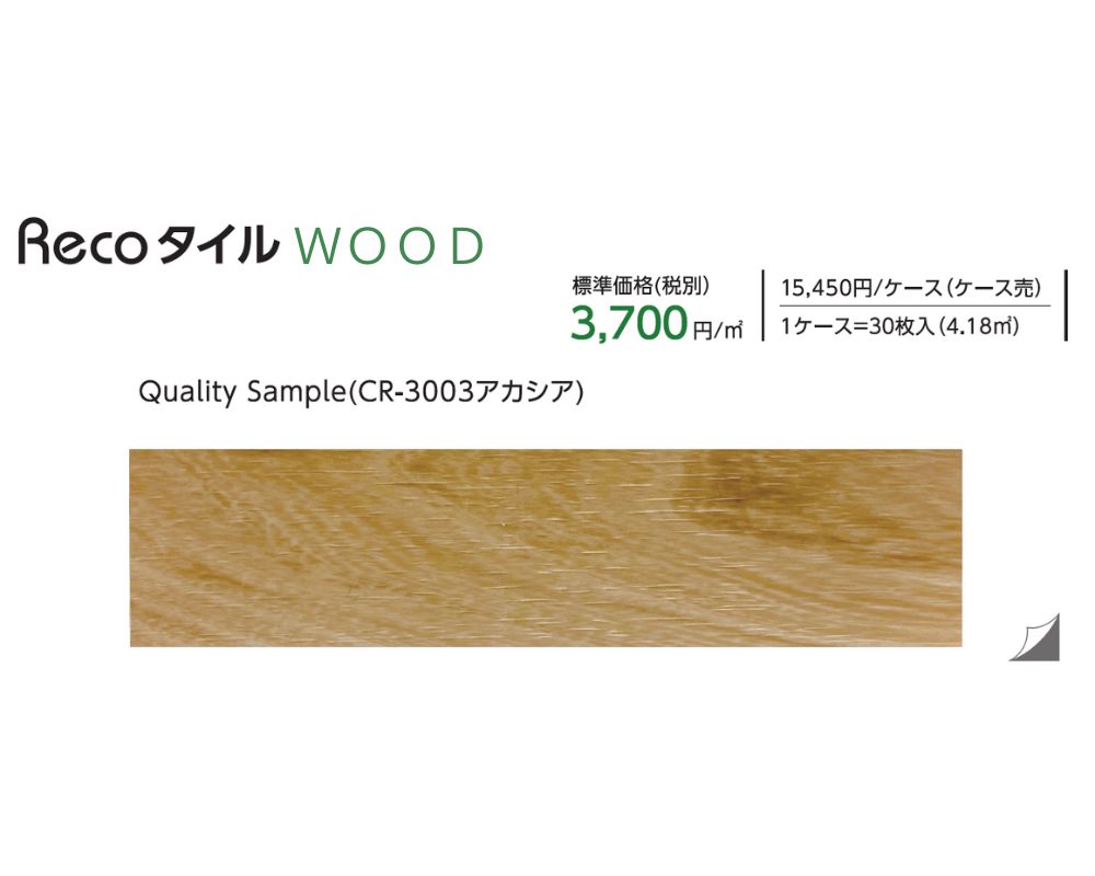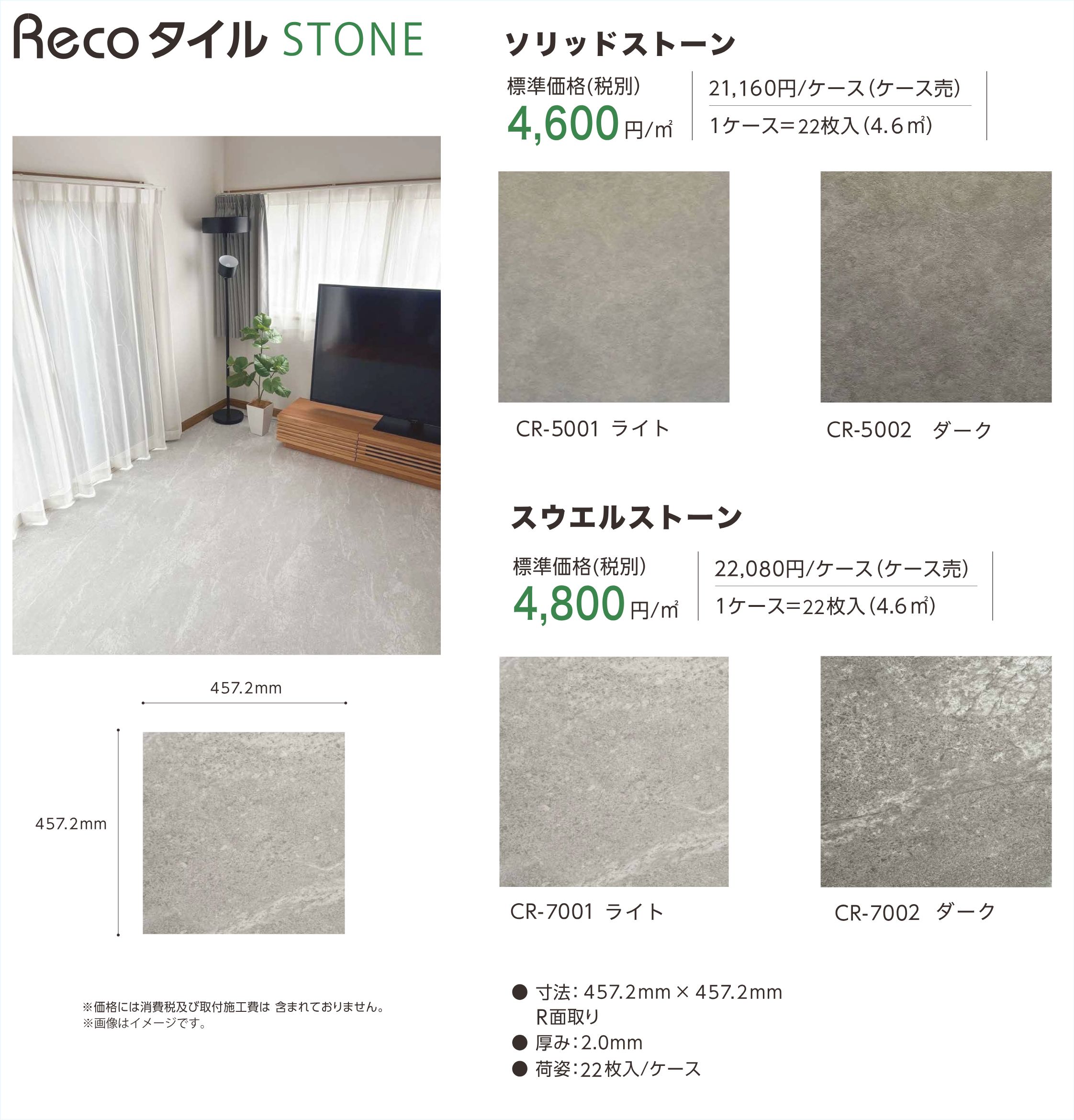 サイズ | Recoタイル WOOD ●寸法:152.4mm×914.4mm 四面面取り ●厚み:2.0mm ●荷姿:30枚入/ケース Recoタイル STONE ●寸法:457.2mm×457.2mm R面取り ●厚み:2.0mm ●荷姿:22枚入/ケース |